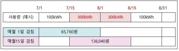 예를 들어, 아래와 같은 전기사용 소비자에 대해 7월1일이 검침일인 경우 사용량 400kWh에 대해 6만5760원의 전기료가 부과될 수 있는 반면, 같은달 15일이 검침일인 경우 600kWh에 대해 13만6040원이 부과돼 2배 가까이 차이가 나게된다.