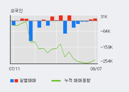 지난 한달을 기준으로 보면 기관이 1주를 순매수했고, 개인들도 18.2만주를 순매수했다. 반면 그동안 외국인은 18.2만주를 순매도했다. 같은 기간 개인의 거래 비중이 94.4%로 가장 높았고, 기관은 거래에 거의 참여하지 않은 것으로 보인다