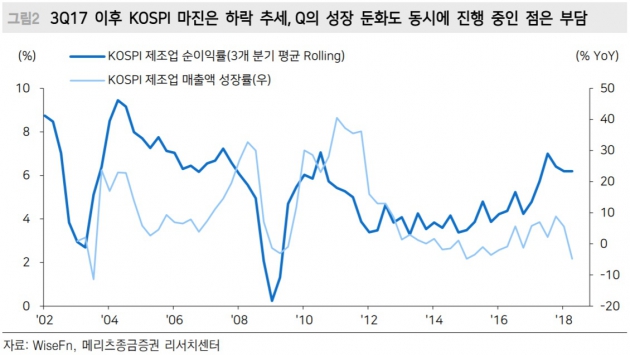 표면적으로는 부진하지만 낮아진 눈높이에 올 1분기보다는 충격이 덜했다는 판단이다. 다만 기업 실적성장의 고점 우려를 자극했다는 점은 부담으로 봤다. 지난 2분기 유가증권시장 제조업의 순이익률은 약 6.2%로 추정되는데, 지난해 3분기 7% 이후 하락세란 것이다. 여기에 매출 성장률도 전년 동기 대비 역성장으로 전환되고 있다.
