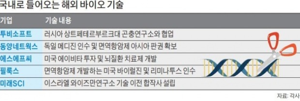 해외 바이오기업을 인수하거나 기술을 들여와 상업화에 나서는 국내 기업도 늘고 있다. 정보기술(IT) 업체인 투비소프트는 러시아 상트페테르부르크대 곤충연구소와 함께 신약 공동개발을 추진하고 있다. 곤충연구소가 발견한 초파리에서 유래된 면역물질 ‘알로페론’의 국내 및 미국 임상을 진행할 계획이다. 알로페론이 헤르페스바이러스(HSV), 급성 B형 간염, 인유두종바이러스(HPV) 등의 치료제로 러시아에서 승인된 만큼 빠른 상업화를 기대하고 있다.