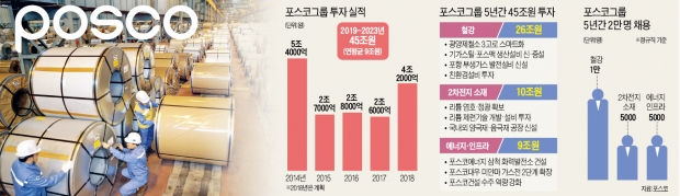 포스코는 45조원 규모의 투자 계획에 맞춰 각 사업 분야 채용도 늘린다. 철강 신기술 개발과 생산현장 경쟁력 확보를 위해 철강 부문에서만 5년간 1만 명을 채용할 방침이다. 신성장동력인 2차전지 소재와 발전 등 에너지 부문에서도 5000명을 충원한다. 건설 등 인프라 분야에서도 5000명을 모두 정규직으로 뽑기로 했다.