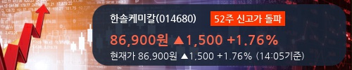 04일 오후 14시 05분 현재 한솔케미칼은 전 거래일 대비 1.76% 오른 86,900원에 거래되고 있다. 한솔케미칼은 이날 5일 만에 52주 신고가를 새로 썼다. 주가의 흐름을 살펴보면 85,400원으로 개장해서 장중 한때 84,000원(-1.64%)까지 살짝 밀렸지만, 상승 반전해서 현재 86,900원(+1.76%)까지 소폭 상승하고 있다.
