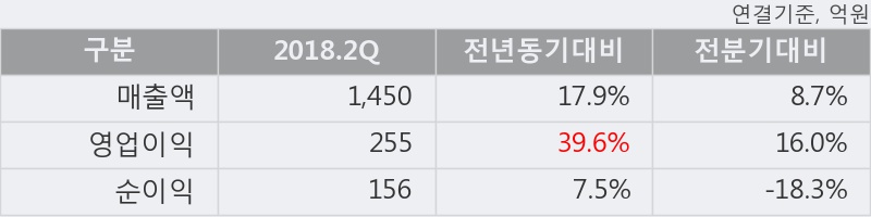 - 2018.2Q, 매출액 1,450억(+17.9%), 영업이익 255억(+39.6%)