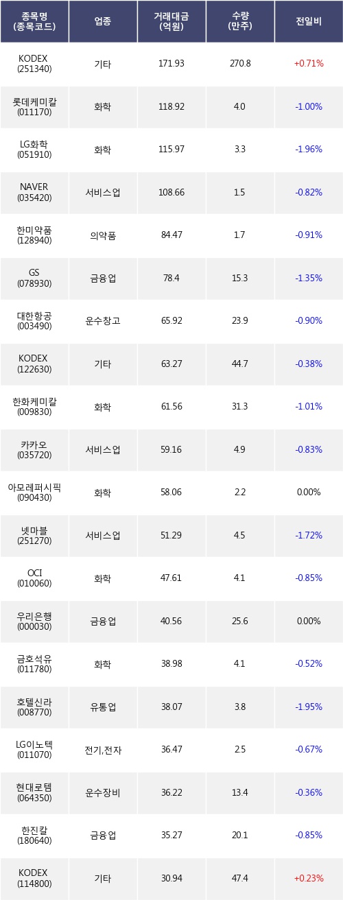 KODEX 코스닥150선물인버스, KODEX 인버스 등은 전일 대비 주가가 상승했고, 롯데케미칼, LG화학, NAVER 등은 주가가 하락했다.