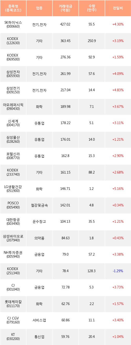 기관 투자자의 순매수 상위 20개 종목은 SK하이닉스, KODEX 레버리지, KODEX 200, 삼성전자, 삼성전기, 아모레퍼시픽, 신세계, 삼성물산, 호텔신라, KODEX 코스닥150 레버리지등이다.