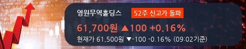영원무역홀딩스는는 20일 오전 09시 02분 현재 코스피 시장에서 전 거래일 대비 -0.16% 상승한 61,500원에 거래되고 있다. 장시작과 함께 0.16% 상승한 61,700원을 기록하며 52주 신고가를 경신했다. 주가의 흐름은 61,700원으로 개장해서 장중 한때 61,400원(-0.32%)까지 소폭 밀렸다가 이후 반등해서 61,500원(-0.16%)까지 회복해낸 모습이다.