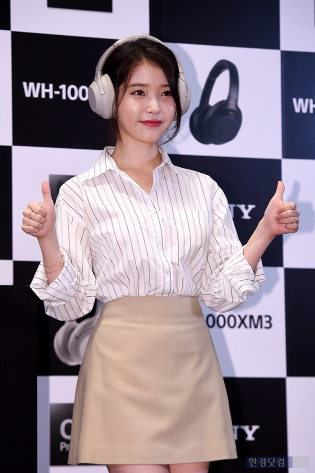 가수 아이유가 서울 동대문 JW 메리어트 동대문 스퀘어에서 열린 소니코리아 무선 노이즈 캔슬링 헤드폰 'WH-1000XM3' 출시 기념 포토웰에 참석해 포토타임을 갖고 있다.