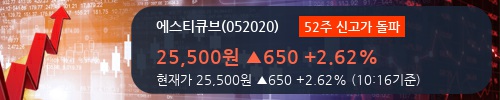 27일 에스티큐브는 장중 25,500원까지 오르며 52주 신고가를 갈아치우고, 현재 전일보다 650원(+2.62%) 오른 25,500원에 거래되고 있다. 주가의 흐름을 살펴보면 24,800원으로 개장해서 장중 한때 24,350원(-2.01%)까지 살짝 밀렸지만, 상승 반전해서 현재 25,500원(+2.62%)까지 소폭 상승하고 있다.