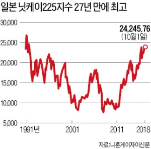 지난달 20일 아베 신조(安倍晋三) 총리가 자민당 총재직 3연임에 성공하면서 정치적 불확실성이 사라진 점도 증시 활황에 도움이 되고 있다. 아베 총리가 기업친화적인 경제정책을 추가로 내놓을 것이라는 기대가 영향을 미쳤다.