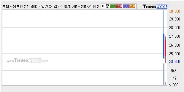 크리스에프앤씨가 장 초반 부터 전일 대비 +10%이상 상승하고 있다. 02일 오전 09시 22분 크리스에프앤씨는 전 거래일보다 11.25% 오른 26,700원에 거래되고 있다. 주가의 흐름은 24,300원으로 개장해서 장중 한때 23,500원(-2.08%)까지 살짝 밀렸지만, 다시 큰 폭으로 올라서 현재 26,700원(+11.25%)까지 상승하고 있다.
