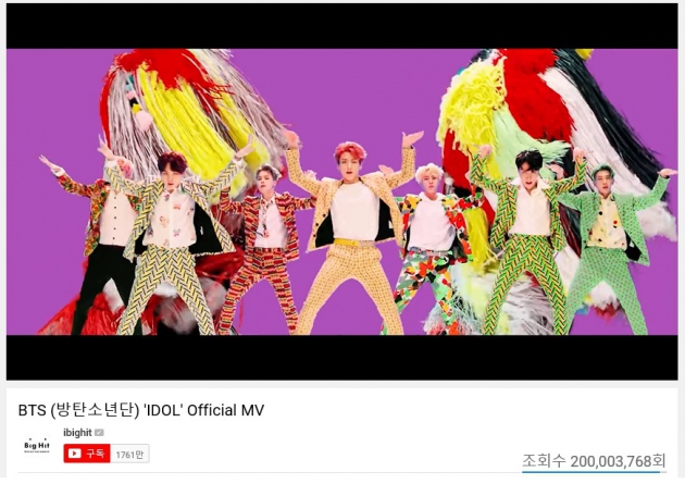 '국가대표' 아이돌 그룹 방탄소년단의 'IDOL' 뮤직비디오가 팬들의 엄청난 사랑에 힘입어 2억뷰를 돌파에 성공했다.