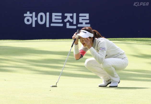 강수연이 7일 경기도 여주 블루헤런GC에서 열린 KLPGA투어 하이트진로 챔피언십 최종라운드 18번홀에서 마지막 퍼팅을 남겨두고 그린을 살피고 있다. 강수연은 이날 대회를 마지막으로 은퇴했다.