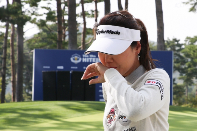 강수연이 7일 경기도 여주 블루헤런GC에서 열린 KLPGA투어 하이트진로 챔피언십 최종라운드 경기를 마친 후 눈물을 흘리고 있다. 강수연은 이날 대회를 마지막으로 은퇴했다.