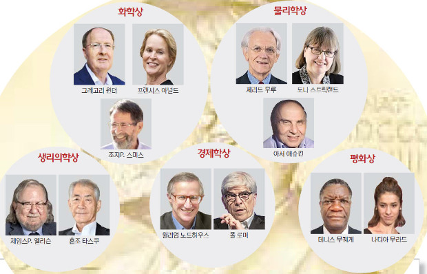 노벨상은 스웨덴의 알프레드 노벨(1833~1896)의 유언에 따라 인류 복지에 공헌한 사람이나 단체에 수여되는 상이다. 물리 화학 생리의학 문학 경제 평화 등 6개 부문에서 수상이 이뤄진다. 올해도 미국은 물리 화학 생리의학 경제에서 고루 수상자를 배출했다. 일본은 혼조 다스쿠 교토대 교수가 새로운 암치료제 개발에 공헌한 공로로 생리의학상 공동 수상자로 선정되면서 과학 분야를 중심으로 24번째 수상자를 냈다. 정치적 성향이 짙은 평화상을 빼고는 한 번도 과학 등 분야에서 노벨상을 받지 못한 한국과 대조적이다. 우리나라가 경제력에 비해 기초과학 분야 토대가 약하다는 지적이 나오는 이유다. 올해는 이례적으로 노벨문학상을 선정하는 스웨덴 한림원에서 발생한 미투 사건으로 문학상 수상은 내년으로 연기된 채 나머지 5개 부문 수상자만 발표됐다.