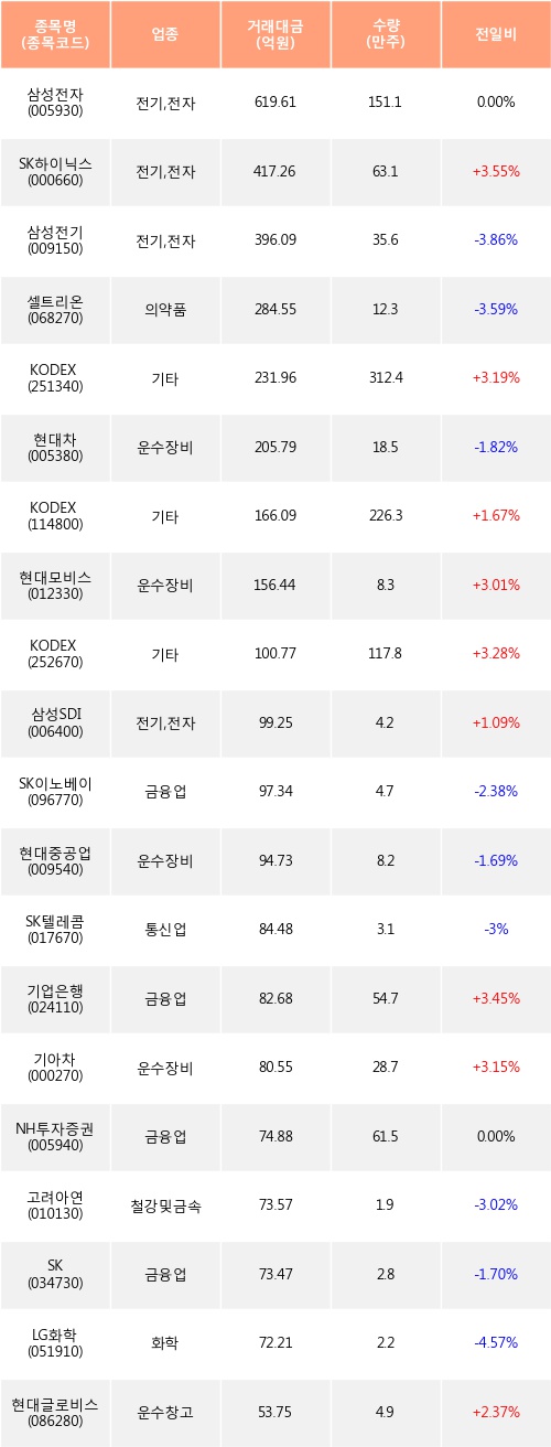 SK하이닉스, KODEX 코스닥150선물인버스, KODEX 인버스 등은 전일 대비 주가가 상승했고, 삼성전기, 셀트리온, 현대차 등은 주가가 하락했다.
