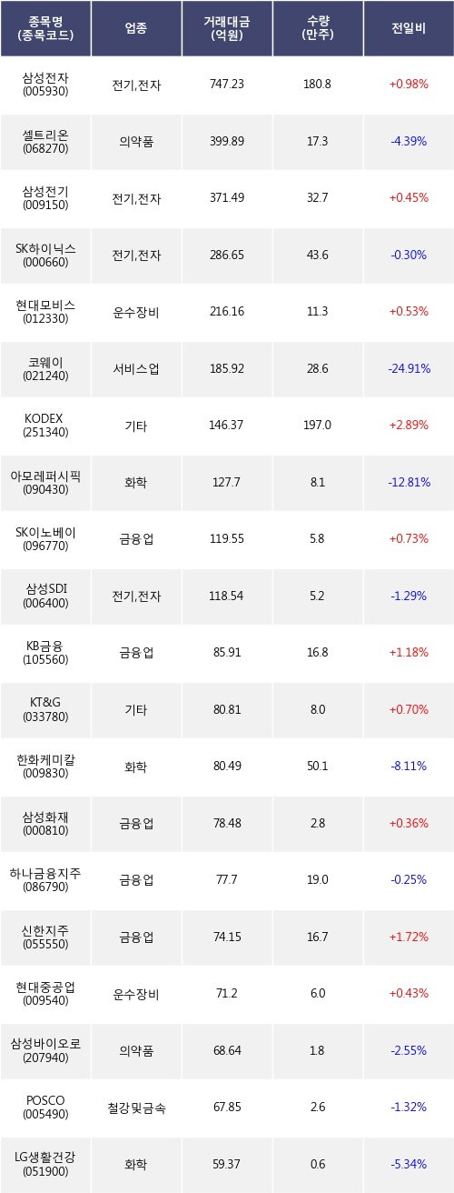 외국인 투자자의 순매도 상위 20개 종목은 삼성전자, 셀트리온, 삼성전기, SK하이닉스, 현대모비스, 코웨이, KODEX 코스닥150선물인버스, 아모레퍼시픽, SK이노베이션, 삼성SDI등이다.