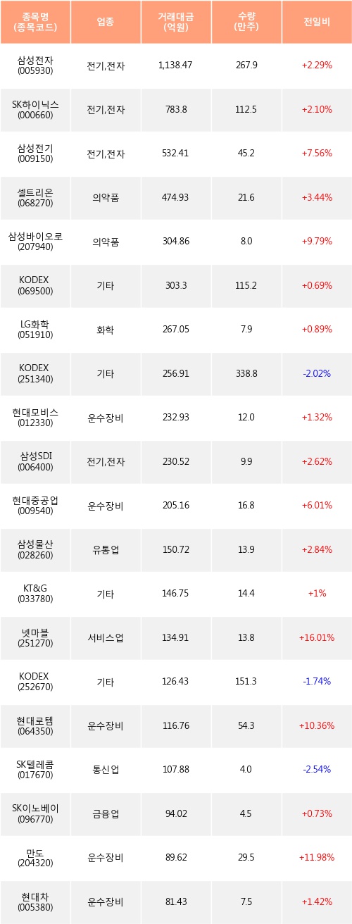 삼성전자, SK하이닉스, 삼성전기 등은 전일 대비 주가가 상승했고, KODEX 코스닥150선물인버스, KODEX 200선물인버스2X, SK텔레콤 등은 주가가 하락했다.