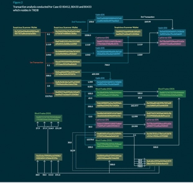 한경닷컴이 블록체인 기반 보안플랫폼 업체 센티넬프로토콜에 의뢰해 조사한 바에 따르면 퓨어빗은 모집 이더리움 일부를 영국령 케이만 군도에 등록된 '블록트레이드(BlockTrades)'란 거래소로 보냈다. 센티넬프로토콜은 사기·해킹 등으로 불법 모집한 암호화폐를 추적해 현금화할 수 없도록 막는 전문업체다.