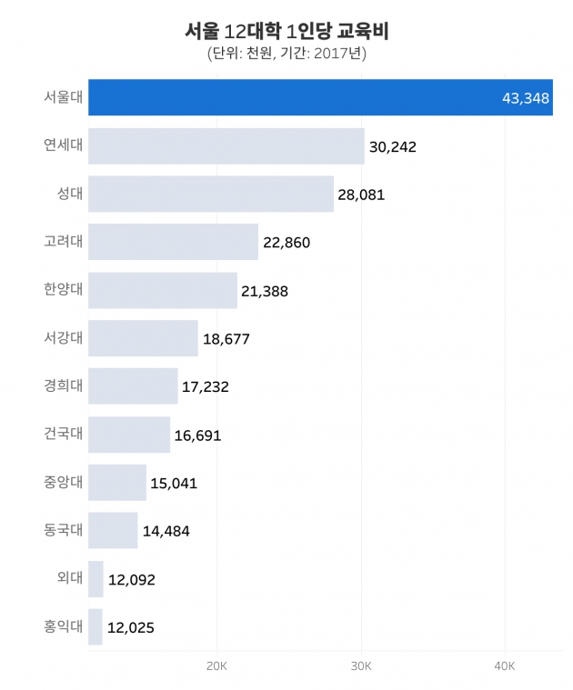 서울 주요 13개 대학 중 1인당 교육비가 가장 높은 학교는 서울대학교입니다. 1년에 학생 1명 당 무려 4334만원을 쓰는군요. 2018년 서울대 1년치 등록금은 601만원입니다. 학교 입장에선 등록금을 제외한 3700만원을 학생에게 더 투자한 셈이군요. 그렇다면 서울대는 나머지 3700만원 교육비를 어디에서 구했을까요? 교육부의 정부지원금이 그만큼 국공립에 투여된다는 뜻입니다.