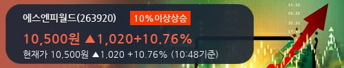21일 오전 10시 48분 현재 에스엔피월드는 전 거래일보다 10.76% 오른 10,500원에 거래되고 있다. 주가의 흐름은 9,560원으로 개장해서 장중 한때 9,300원(-1.9%)까지 살짝 밀렸지만, 다시 큰 폭으로 올라서 현재 10,500원(+10.76%)까지 상승하고 있다.