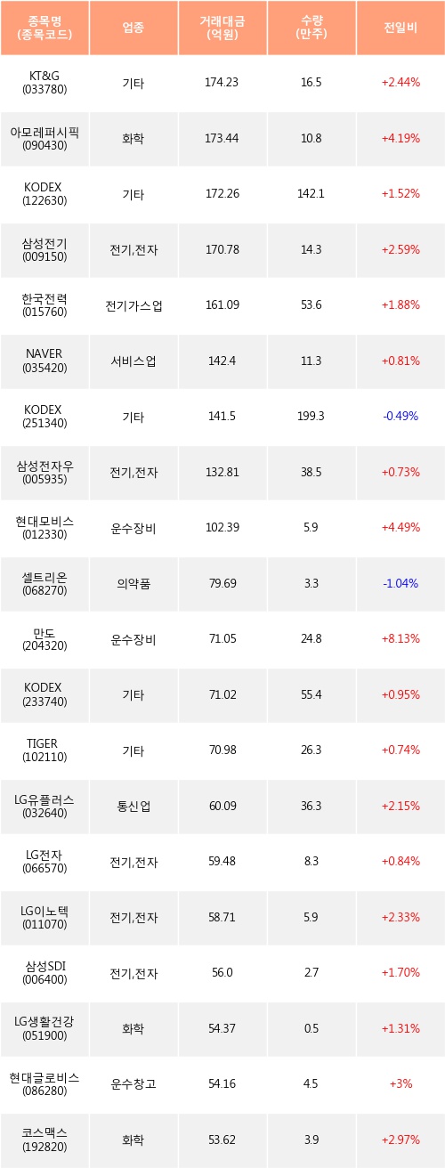 기관 투자자의 순매수 상위 20개 종목은 KT&G, 아모레퍼시픽, KODEX 레버리지, 삼성전기, 한국전력, NAVER, KODEX 코스닥150선물인버스, 삼성전자우, 현대모비스, 셀트리온등이다.