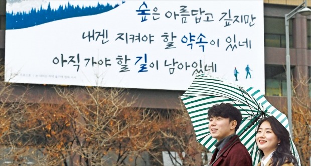 [ 강은구 기자 ] 교보생명이 겨울을 맞아 서울 광화문 사옥에 3일 시인 로버트 프로스트의 시 ‘눈 내리는 저녁 숲가에 멈춰 서서’ 중 한 구절을 내걸었다. 새 옷으로 갈아입은 ‘광화문글판’ 앞을 시민들이 우산을 쓴 채 지나고 있다. 강은구 기자 egkang@hankyung.com