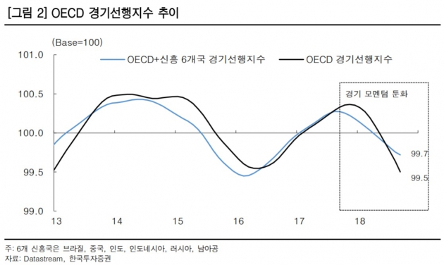 김대준 연구원은 "2019년에는 올해 나타났던 경기둔화세가 지속될 것"이라며 "현재 선진국과 신흥국을 포함한 경제협력개발기구(OECD) 경기선행지수는 기준선인 100을 밑돌고 있는데, 정황상 단기에 반등할 가능성은 낮다"고 말했다. 세계 경기를 주도하는 미국과 중국의 성장률이 하락할 것이기 때문이다.