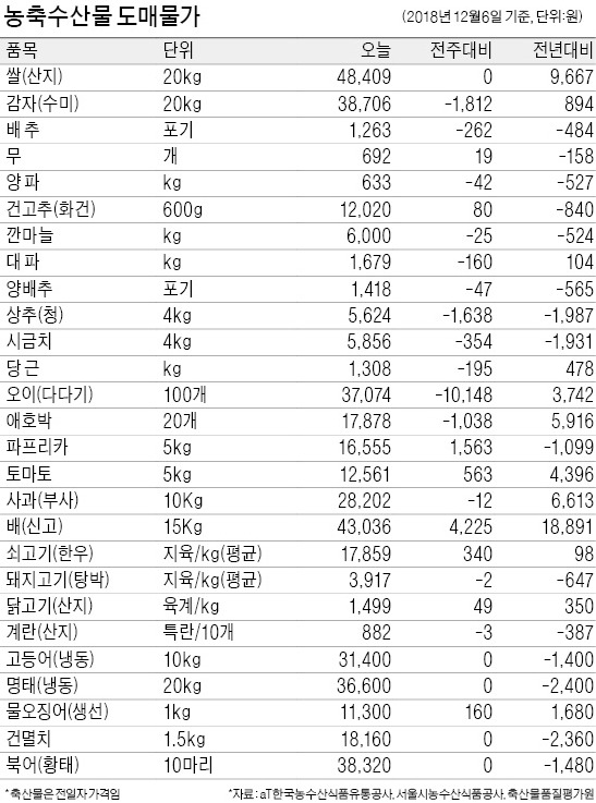 이번주에 가격이 내려간 것은 감자(수미) 배추 양파 대파 상추 애호박 등이었으며, 파프리카 토마토 배 소고기 등은 가격이 올랐다. 오이를 제외하고는 모두 큰 폭의 변동을 보이지 않았다.