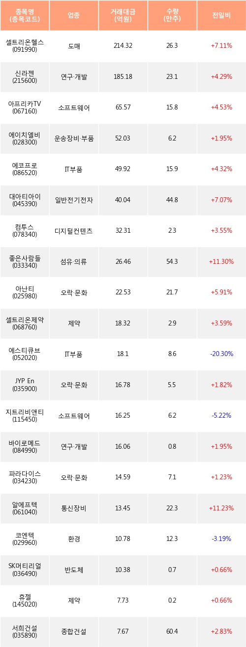 셀트리온헬스케어, 신라젠, 아프리카TV 등은 전일 대비 주가가 상승했고, 에스티큐브, 지트리비앤티, 코엔텍 등은 주가가 하락했다.