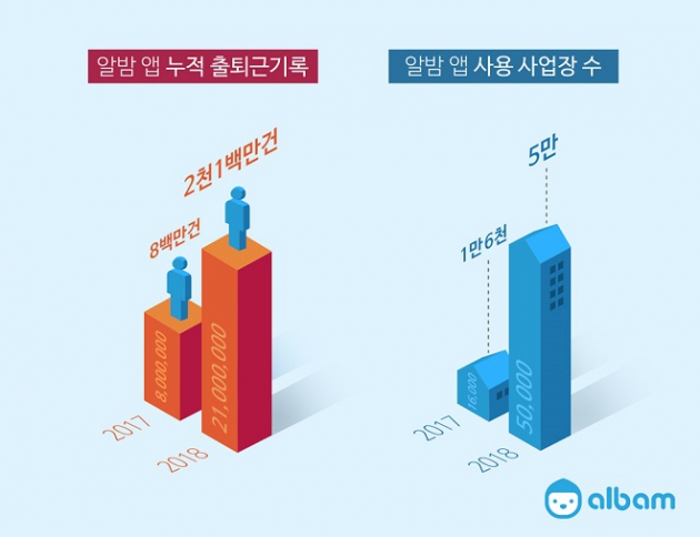 푸른밤은 알밤 사용 사업장 5만 개 중 약 3만 개가 올해 가입한 사업장이라고 소개했다. 인사총무 담당자가 근태에 따른 급여 내역을 반영하기 어려운 소기업들이 많이 가입했다는 설명이다. 서비스 출시 후 올해 말까지 누적 출퇴근 기록 수는 2100만 건에 달한다.