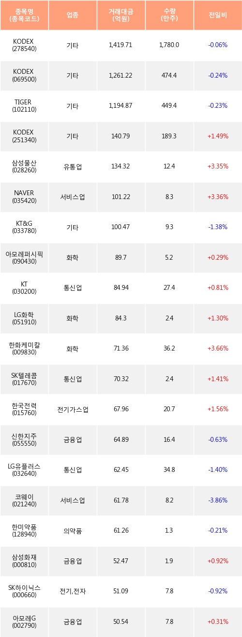 기관 투자자의 순매수 상위 20개 종목은 KODEX MSCI Korea TR, KODEX 200, TIGER 200, KODEX 코스닥150선물인버스, 삼성물산, NAVER, KT&G, 아모레퍼시픽, KT, LG화학등이다.