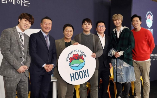 재단법인 W재단이 12일 서울 강남구 알베르 카페에서 주최한 '정글의 법칙 김병만과 HOOXI(대국민온실가스감축운동)가 함께하는 자선 토크콘서트' 에 참가한 연사들이 기념사진을 촬영하고 있다. 대국민온실가스감축운동 모바일 전용 후시앱 베타서비스를 기념하기 열린 이날 행사에는 정글의법칙 개그맨김병만, 김진호PD, 김환아나운서, W재단 이욱 이사장, 한국기후변화연구원 이충국 센터장, 유투버 악어와 특급 게스트들이 연사로 참여했다.