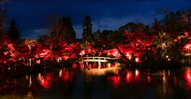 입장 후 가장 많은 사람들이 찾는 곳은 경내의 연못이다. 연못에는 작은 사당으로 연결되는 다리가 놓여 있는데 단풍을 밝히는 야간 조명과 어우러진 풍경은 눈까지 붉게 물들일 지경이다. 연못 옆에는 차를 마실 수 있는 공간도 있어서 잠시 쉴 수도 있다. 낙엽이 융단처럼 깔린 길을 오가다 보면 마치 레드카펫 위를 걷는 듯한 기분이 들 것이다. 하지만 교토에서 가장 유명한 단풍 명소인 만큼 방문객이 워낙 많아 붐비는 것은 각오해야 한다.
