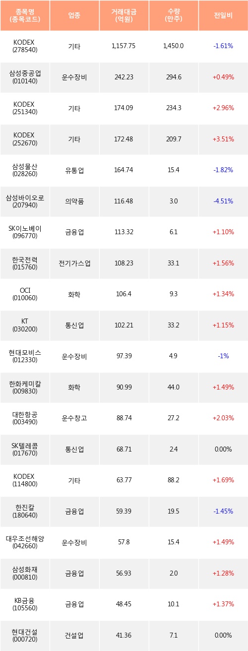 기관 투자자의 순매수 상위 20개 종목은 KODEX MSCI Korea TR, 삼성중공업, KODEX 코스닥150선물인버스, KODEX 200선물인버스2X, 삼성물산, 삼성바이오로직스, SK이노베이션, 한국전력, OCI, KT등이다.