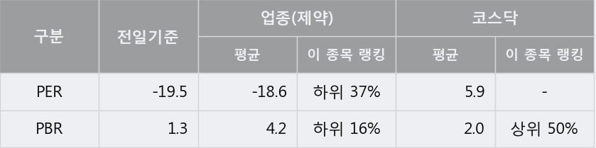 당기순이익 적자로 인해 이 종목의 PER는 마이너스이고, PBR은 1.3배이다. PER는 마이너스라서 제약업종의 평균 PER -18.6배 대비 -0.9배 낮은 수준이고, PBR은 제약업종의 평균 PBR 4.2배 대비 -2.9배 낮은 수준으로 업종 내에서 하위 16%에 위치한다.