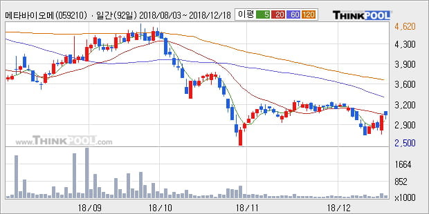 18일 오후 14시 29분 현재 메타바이오메드는 전 거래일보다 12.79% 오른 3,395원에 거래되고 있다. 주가의 흐름을 살펴보면 3,090원으로 개장해서 장중 한때 2,950원(-1.99%)까지 살짝 밀렸지만, 다시 큰 폭으로 올라서 현재 3,395원(+12.79%)까지 상승하고 있다.