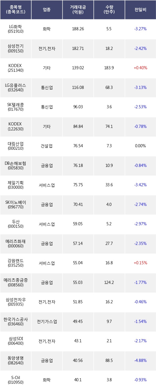 기관 투자자의 순매도 상위 20개 종목은 LG화학, 삼성전기, KODEX 코스닥150선물인버스, LG유플러스, SK텔레콤, KODEX 레버리지, 대림산업, DB손해보험, 제일기획, SK이노베이션등이다.