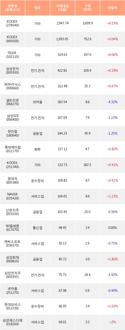 KODEX MSCI Korea TR, KODEX 200, TIGER 200 등은 전일 대비 주가가 상승했고, 셀트리온, 삼성SDI, 한진칼 등은 주가가 하락했다.