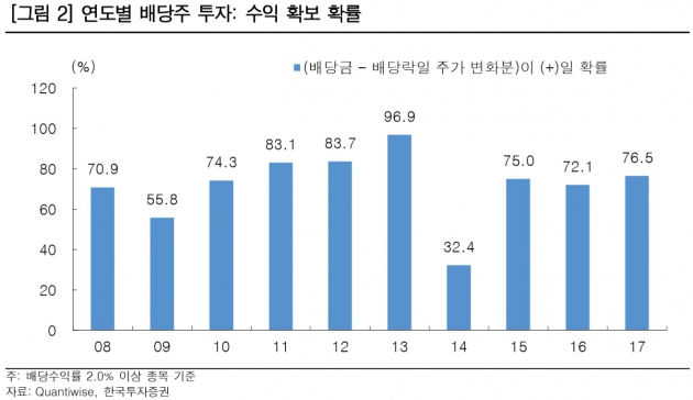 김 연구원은 "96.9%의 확률로 배당금이 배당락일 주가 하락분보다 높았다"며 "최근 10년 평균으로는 배당수익률 2% 이상 고배당주의 70%가 수익을 얻었다"고 했다.