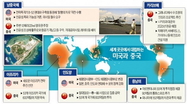 중국이 급속히 커진 경제력을 바탕으로 군사적 영향력을 확대해나가자 미·중은 세계 곳곳에서 충돌하고 있다. 중국을 견제하려는 미국의 움직임도 늘고 있어서다. 시진핑(習近平) 중국 국가주석이 2013년 집권한 뒤 나타난 현상이다. 시 주석은 대외정책의 원칙으로 덩샤오핑(鄧小平)의 ‘도광양회(韜光養晦: 조용히 때를 기다리며 힘을 키운다)’를 폐기하고 ‘중국몽(中國夢: 중화민족의 위대한 부흥)’과 ‘분발유위(奮發有爲: 떨쳐 일어나 해야 할 일을 한다)’를 제시하고 있다.