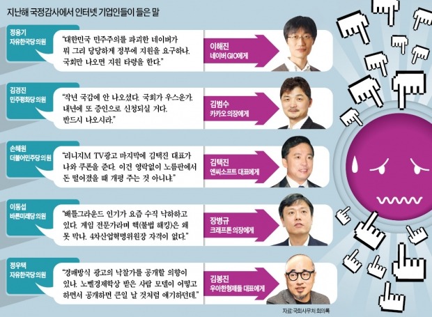 선배들이 이곳저곳에서 겪는 ‘수모’는 후배 창업자를 더 위축시키고 있다. 국회는 지난해 10월 국정감사에서 국내 대표 벤처 1세대 기업인들을 대거 증인으로 채택했다. 당시 이해진 네이버 창업자는 “정권이 바뀌면 네이버는 죽을 수 있다”, 김범수 카카오 창업자는 “내년에 또 나오게 하겠다” 같은 협박성 발언을 들었다. 김택진 엔씨소프트 창업자를 ‘노름판에서 개평 주는 사람’에 비유한 의원도 있다.
