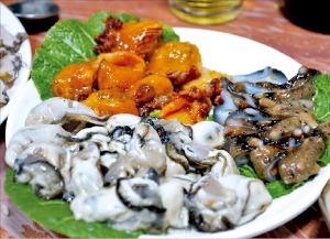 맛의 고장, 전라도 태생인 필자가 처음 경상도 통영에 매혹된 것은 오로지 음식 때문이었다. 통영이 전라도 음식에서 발견되던 개미진(감칠맛 나다의 전라도 사투리) 맛의 유전자가 경상도에도 있다는 사실을 알려주었기 때문이다. 경상도 음식은 맛없다는 편견을 깨뜨려준 도시 통영. 특히 해산물 요리에 관한 한 통영은 이 나라 으뜸이다. 그중에서도 겨울 통영의 맛은 극상이다. ‘통영은 맛있다’는 찬탄이 절로 나올 정도다. 골목으로 들어서면 아직 8000원짜리 회정식을 파는 집이 있고, 뚝배기 하나를 시켜도 생굴이나 멸치회무침 등이 반찬으로 나온다. 그중 압권은 역시 ‘다찌집’이다. 다찌집이란 술을 시키면 안주는 그날그날 주인 마음대로 내주는 선술집이다. 정확한 어원은 알 수 없지만 다찌노미란 일본 말에서 유래했다는 설이 유력하다. 아무튼 관광 다찌가 아니라 지역 사람들이 애용하는 다찌집을 잘만 찾아가면 겨울에 맛볼 수 있는 거의 모든 해산물을 한 상에서 받아볼 수 있다. 그것도 이미 만들어 놓은 식은 음식이 아니다. 즉석에서 해 주는 대면 요리다. 최근에 자주 가는 단골 다찌집에서 헤아려 보니 회를 포함한 싱싱한 날것의 수만 11가지나 됐다. 방어회, 전복, 멍게, 호래기, 개불, 피조개, 오징어, 참소라, 굴, 해삼, 해삼내장젓. 통영이 아니면 불가능한 차림이다. 시금치나 몰 등의 나물류도 더없이 맛깔스럽다. 개조개 유곽이나 해물잡채 등 통영 아니면 맛볼 수 없는 진귀한 요리들도 나온다. 경상도 음식을 얕잡아 보던 전주나 목포 사람들도 통영 다찌 음식을 한 번 맛보고 나면 엄지를 치켜든다.물산이 풍부해서 요리가 발달한 통영