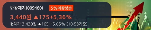 08일 오전 10시 53분 현재 한창제지는 전 거래일보다 5.05% 오른 3,430원에 거래되고 있다. 주가의 흐름을 살펴보면 3,210원으로 개장해서 장중 한때 3,185원(-2.45%)까지 소폭 밀렸다가 다시 3,440원(+5.36%)까지 상승 반전한 후, 현재는 3,430원(+5.05%)에서 머물면서 장중에 많이 상승한 모습이다.