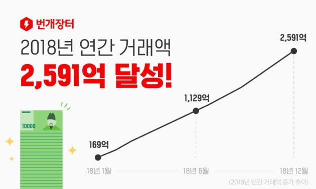 모바일 중고마켓 번개장터는 지난 해 연간 거래액 2591억원을 달성했다고 18일 밝혔다. 전년보다 90% 늘어난 수치다.번개장터는 2016년 11월 거래액 집계를 시작한 뒤 26개월 연속 성장을 이어갔다. 2017년 4분기에는 분기별 거래액 500억원을 돌파했고, 지난해 4분기에는 전년 동기보다 54% 증가한 836억원을 기록했다.