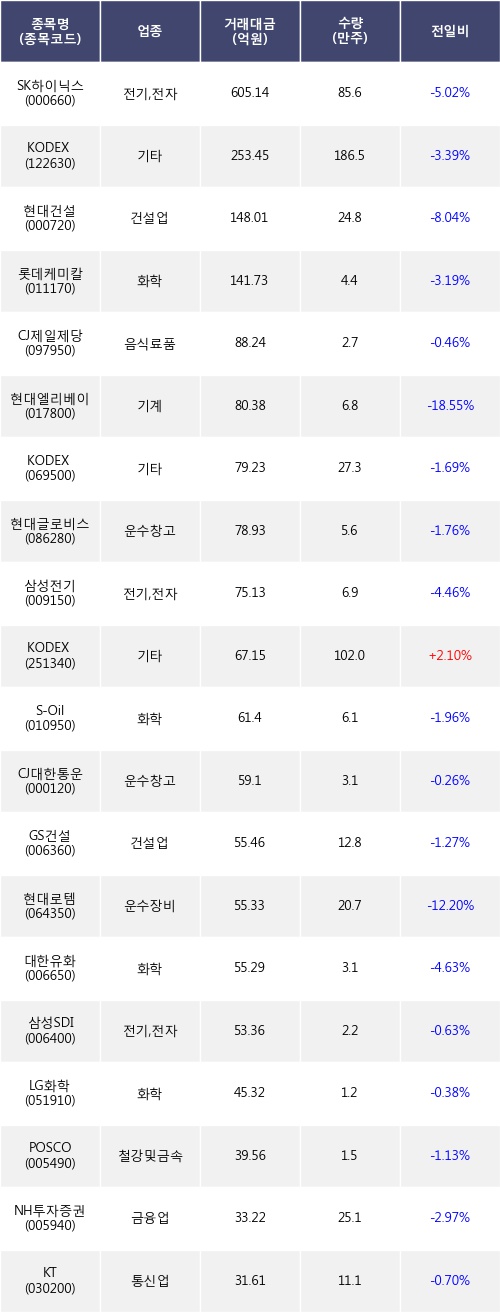 KODEX 코스닥150선물인버스 등은 전일 대비 주가가 상승했고, SK하이닉스, KODEX 레버리지, 현대건설 등은 주가가 하락했다.