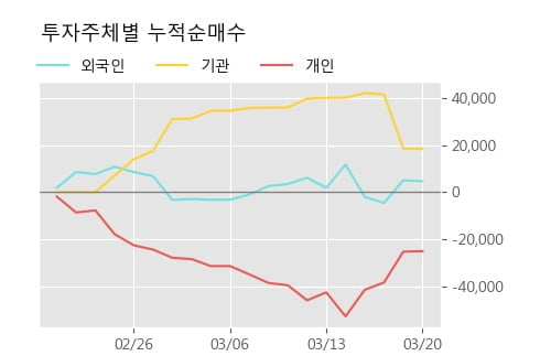 지난 한달을 기준으로 보면 외국인이 1,065주를 순매수했고, 기관도 1.8만주를 순매수했다. 반면 개인들은 2.1만주를 순매도한 것으로 나타났다. 같은 기간 개인의 거래비중이 94.6%로 가장 높아, 주요 거래 주체로 참여했음을 알 수 있다.