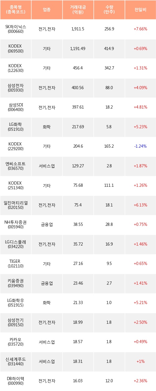 기관 투자자의 순매수 상위 20개 종목은 SK하이닉스, KODEX 200, KODEX 레버리지, 삼성전자, 삼성SDI, LG화학, KODEX 코스닥 150, 엔씨소프트, KODEX 코스닥150선물인버스, 일진머티리얼즈등이다.