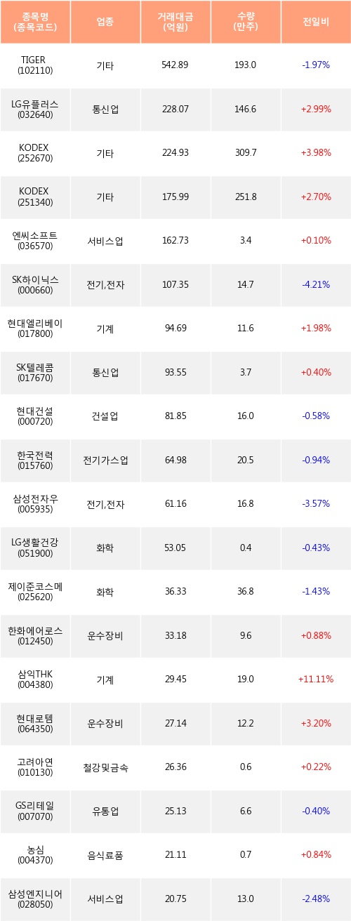 기관 투자자의 순매수 상위 20개 종목은 TIGER 200, LG유플러스, KODEX 200선물인버스2X, KODEX 코스닥150선물인버스, 엔씨소프트, SK하이닉스, 현대엘리베이, SK텔레콤, 현대건설, 한국전력등이다.