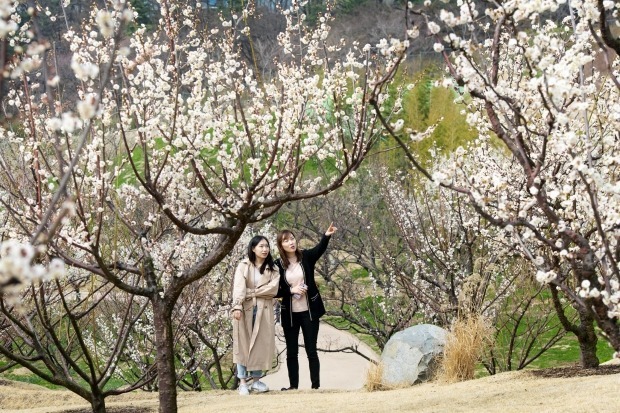 28일 경기도 용인시 에버랜드 '하늘 매화길'에서 시민들이 활짝 핀 매화를 보며 봄기운을 만끽하고 있다. 매화를 테마로 한 정원인 '하늘 매화길'은 29일 정식 오픈한다.에버랜드 제공