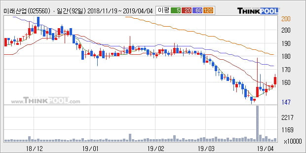 04일 오전 10시 52분 현재 미래산업은 전 거래일보다 6.96% 오른 169원에 거래되고 있다. 주가의 흐름을 살펴보면 159원으로 개장해서 장중 한때 157원(-0.63%)까지 소폭 밀렸다가 다시 170원(+7.59%)까지 상승 반전한 후, 현재는 169원(+6.96%)에서 머물면서 장중에 많이 상승한 모습이다.